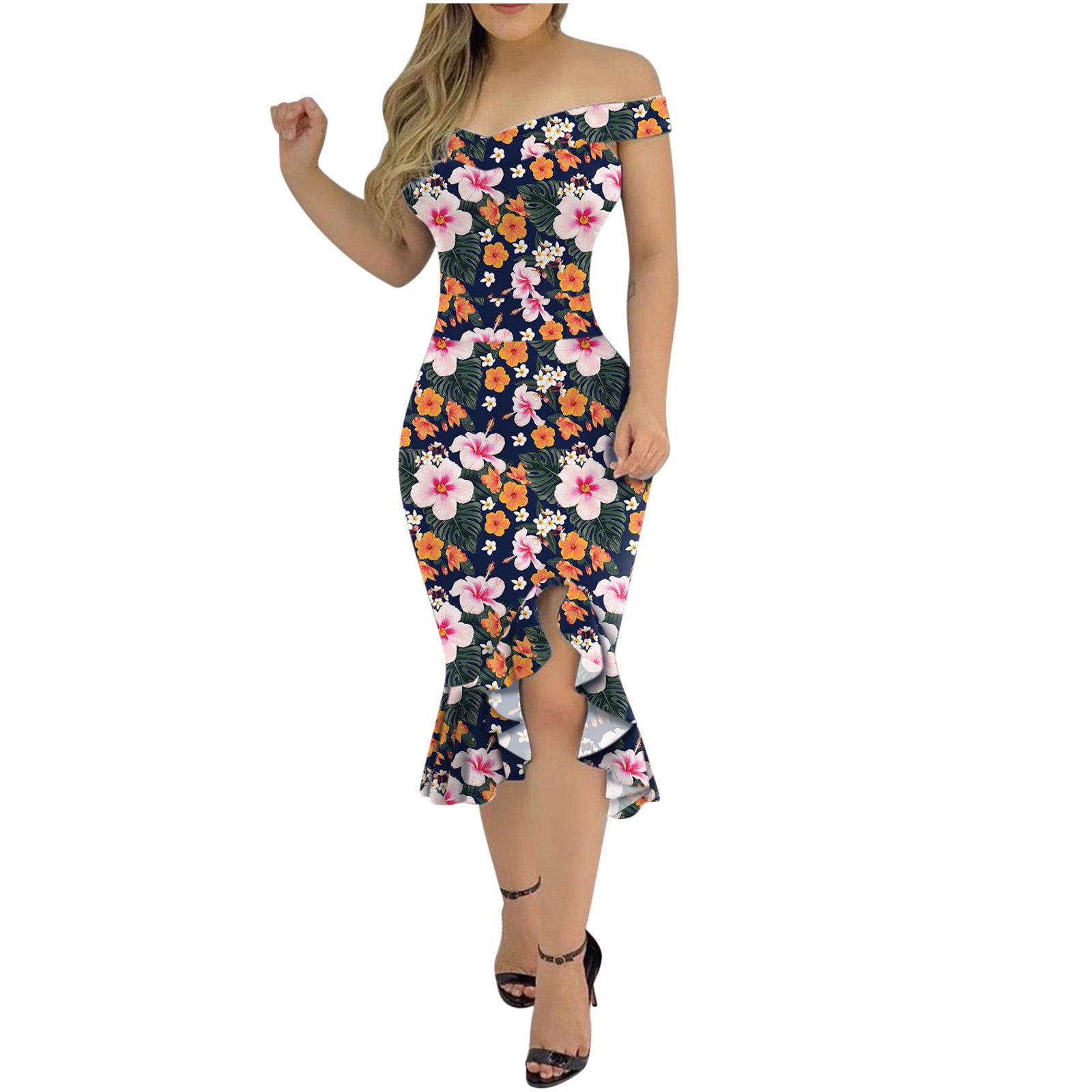 Juebong Women Off Shoulder Dress With Irregular Ruffled Hem Pattern Mid Length Dress Cold Shoulder One Piece High Waist Dress Long Beach Vacation Dresses Walmart Com